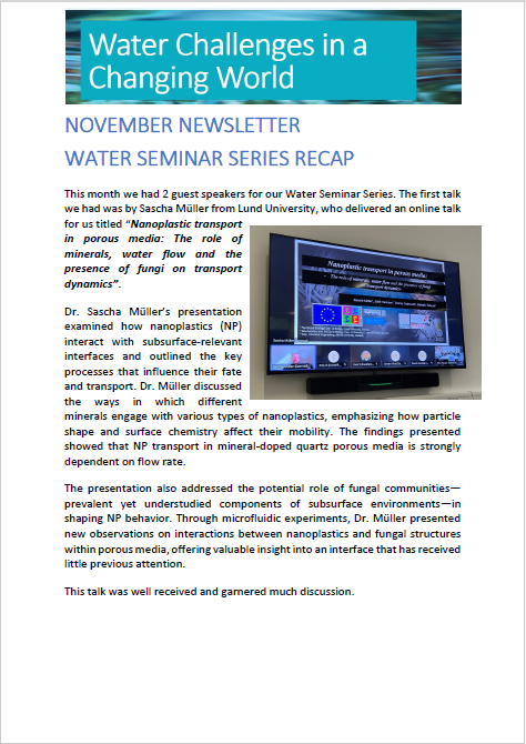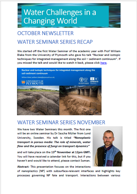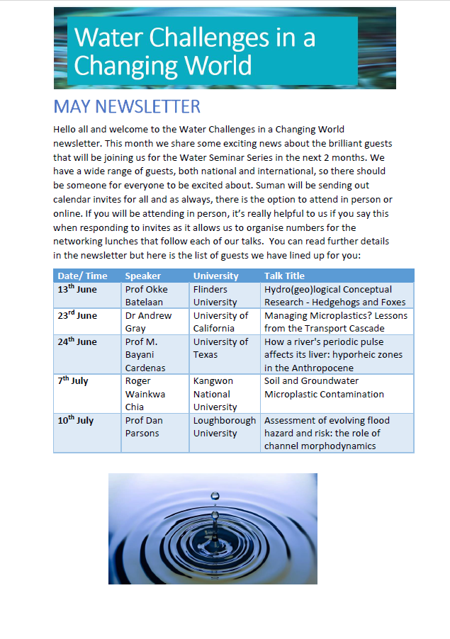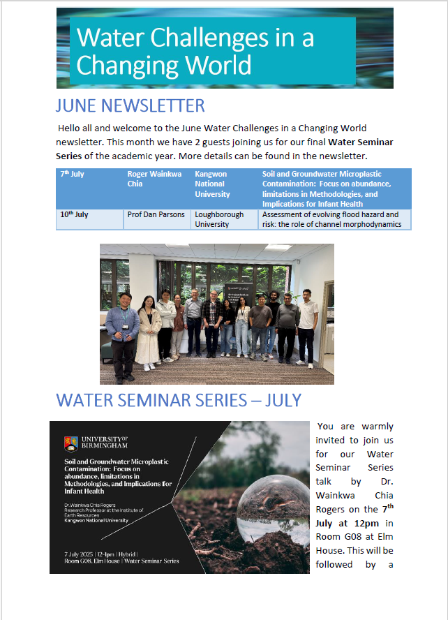 Newsletter Click below to read through our monthly newsletters containing the latest Water Challenges in a Changing World theme news.If you would like to subscribe to these monthly newsletters, please contact s.hira@bham.ac.uk. 2025 2024 2023